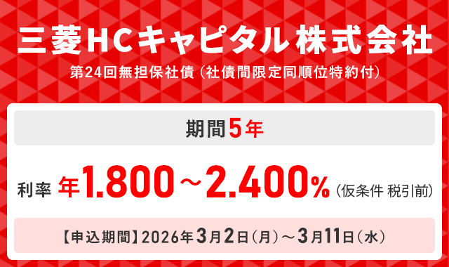 上記の手数料等およびリスク等は商品ごとに異なりますので、当該商品等の契約締結前交付書面や目論見書またはお客さま向け資料等をよくお読みください。なお、目論見書等のお問い合わせは当社各部店までお願いいたします。