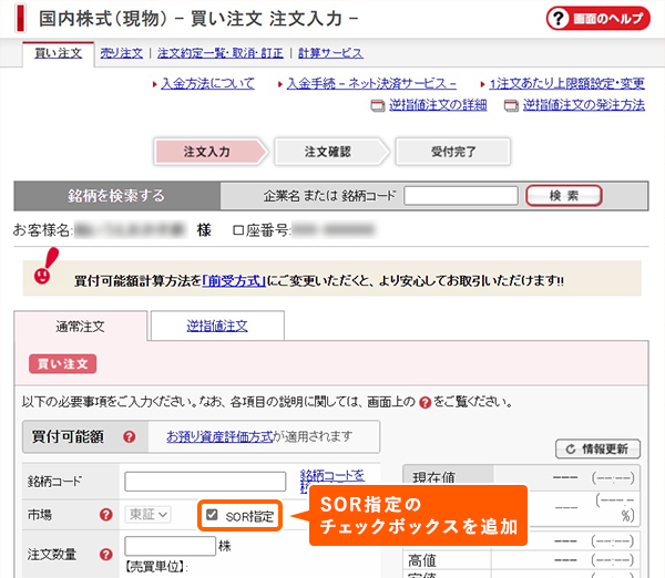 初期設定ではチェックが入っているため、そのまま注文された場合、SOR注文として受付いたします。