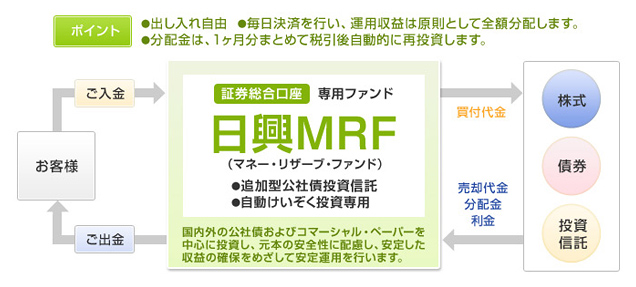 証券総合口座では株式、債券、投資信託などの売却代金、利金・分配金などを日興MRFで自動的に運用します。