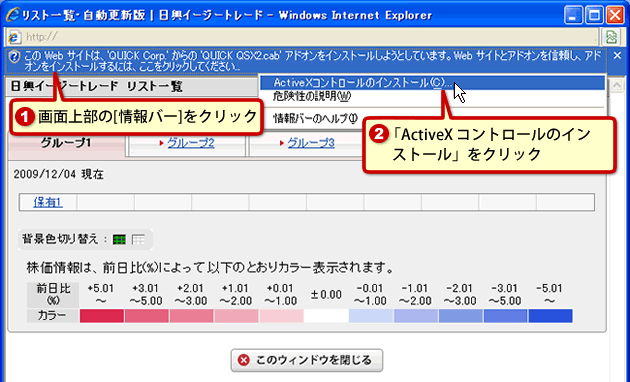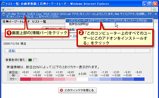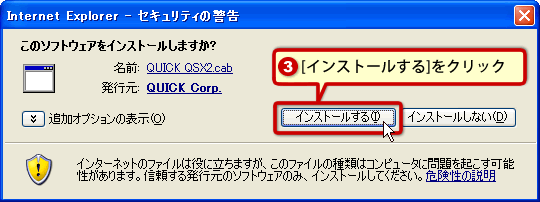 画面上部の「情報バー」に『この Web サイトは、 'QUICKCorp.' からの 'QUICK QSX2.cab' アドオンをインストールしようとしています。 Web サイトとアドオンを信頼し、アドオンをインストールするには、ここをクリックしてください…』と表示されます。