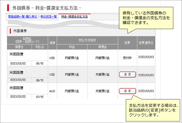 利金・償還金支払方法画面で、保有している外国債券の利金・償還金の支払方法を確認できます。