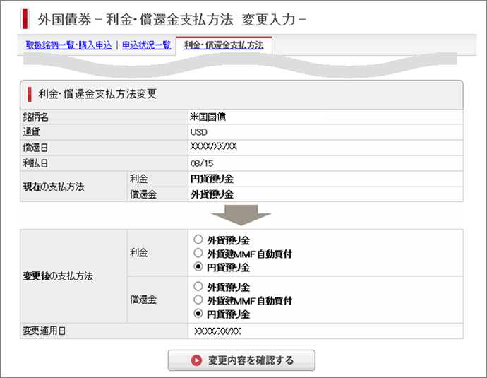 変更後の利金・償還金の支払方法を指定し、[変更内容を確認する]ボタンをクリックします。