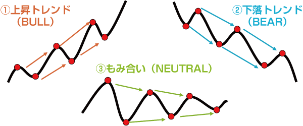 トレンドのパターンは3種類あります。右肩上がりの上昇トレンド(BULL)、右肩下がりの下落トレンド(BEAR)、上昇下落でいったりきたりのもみ合い(NEUTRAL)があります。