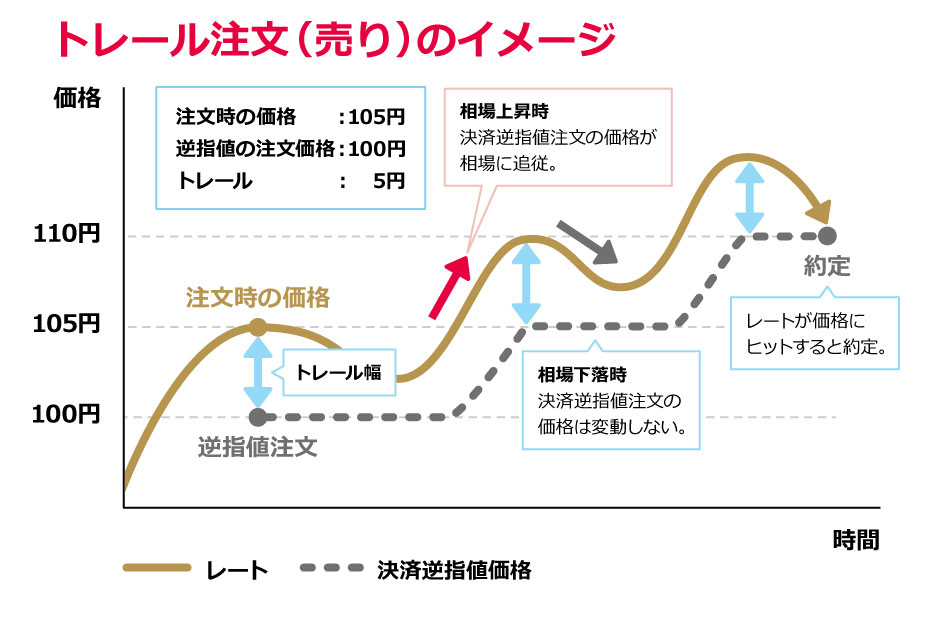 トレール注文とは、逆指値の注文価格がレートの変動に応じて自動的に変更される注文方法です。注文時に逆指値の注文価格とトレール幅(決済価格とレートのかい離幅)を設定します。レートがポジションにとって有利な方向に変動した場合、逆指値注文の注文価格がトレール幅を維持するよう自動的に変更されます。レートが不利な方向に変動した場合、変更は行われず、注文価格に達した時点でその価格で約定します。