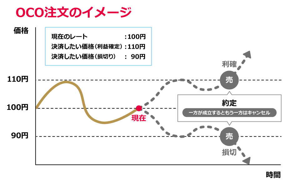 指値注文と逆指値注文の両方の注文価格を指定する注文です。先に取引条件に合致した注文で取引が成立します。例えば、USD/JPYの現在のレートで買ポジションを持った時、110円で収益を確定(指値で売却)、90円で損切り(逆指値で売却)という2つの決済注文を同時に注文することができます。