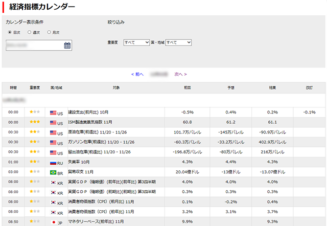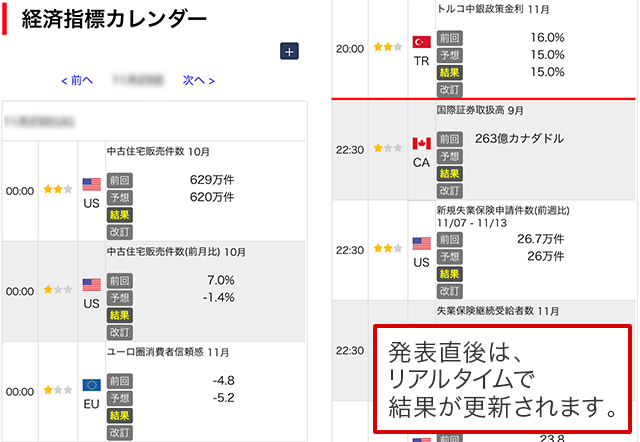 発表時刻、予想値、前回値が掲載され、結果は指標発表後速やかに更新されます。
