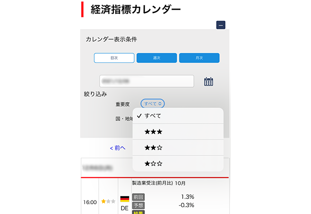 各国の経済指標は、重要度(★)や対象国による絞り込み、日次・週次・月次表示も手軽に行えます。以下はスマートフォンの場合の操作になります。