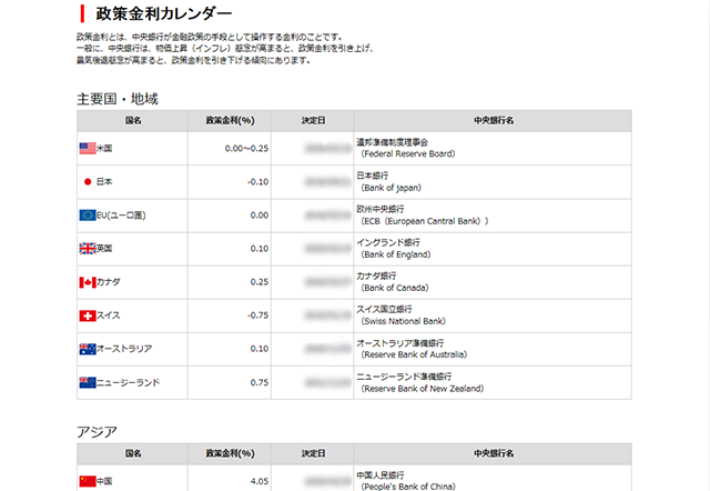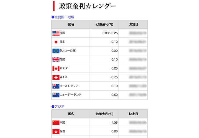 米国や日本、ユーロなど主要国・地域だけでなく、中国や香港などのアジア、トルコやスウェーデン、南アフリカなど21カ国の政策金利を一覧で確認できます。