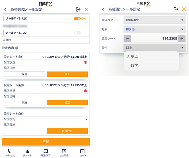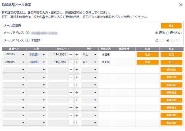 気になる通貨ペアのレートが規定値に達した時にメールでお知らせします。