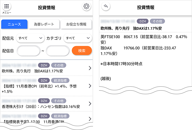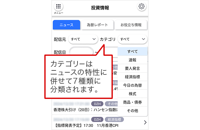 配信日や配信元、カテゴリーなどをもとに絞り込み、気になるニュースをピックアップすることができます。以下はFXアプリおよびスマートフォンの場合の操作になります。