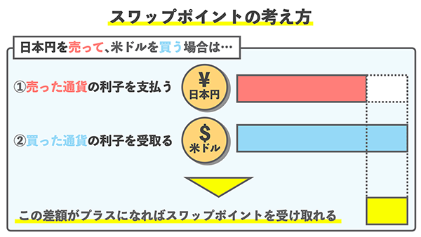 具体的には、FXでは米ドルと円など、ある外貨を買い、もう一方の外貨を売ることになりますが、この時にそれぞれ金利が発生します。この通貨間の金利差が実際に受け取ることができる(もしくは支払うことになる)スワップポイントとなります。