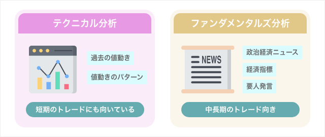 ファンダメンタルズ分析は、中長期のトレンドの把握に向いており、対してテクニカル分析はファンダメンタルの影響を受けにくい短期のデイトレード・スキャルピングなどにも利用できます。