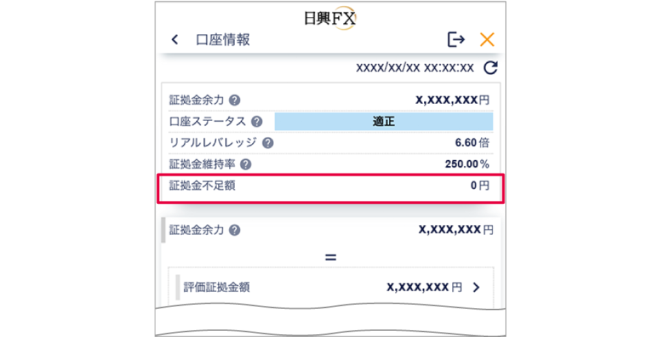 取引サイトのトップ画面上部の「口座ステータス」、または口座情報画面の「口座ステータス」および「証拠金不足額」をご確認ください。追加証拠金が発生した際は、「証拠金不足通知メール」※にて必要な入金額を通知しております。