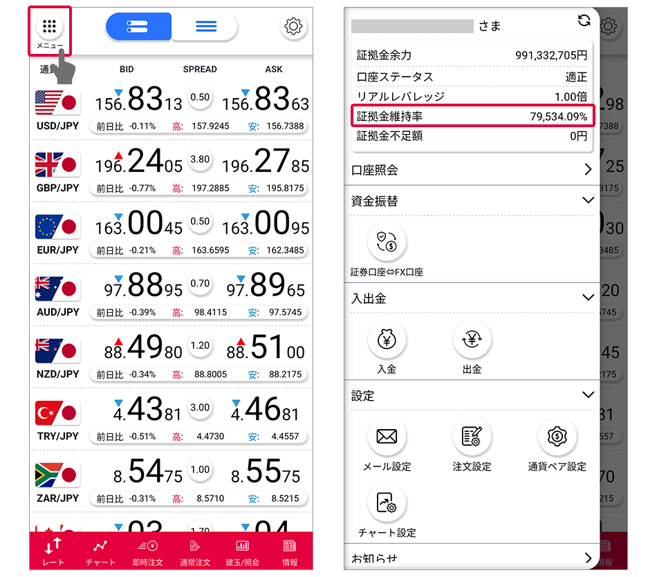 ロスカットや追加証拠金の判定は証拠金維持率に応じて行われます。現在の証拠金維持率は、FXアプリおよび取引サイトのメニュー画面にある「口座情報」の「証拠金維持率」欄にて計算式も含めご確認いただけます。また、パソコン用の取引サイトでは、トップ画面上段に表示されています。