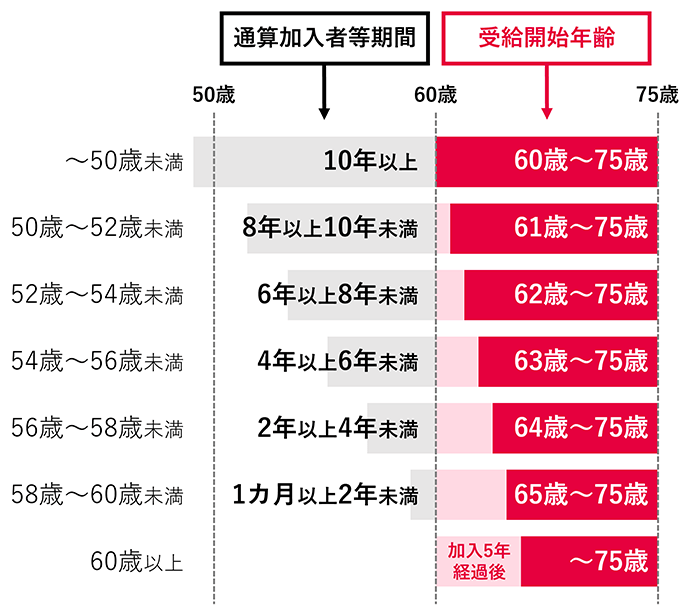 例えば、60歳でiDeCoに加入した場合、5年間で拠出した資産を65〜75歳の間に受け取ることができます。