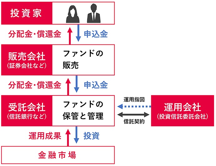 投資家が、証券会社や銀行などの販売会社を通して投資信託を購入すると、その集まったお金は受託会社にわたり保管・管理することになります。