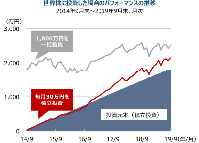 (注1)世界株はMSCIオール・カントリー・ワールド・インデックス(配当込み、円ベース)。積立投資は2014年9月末から2019年8月末の各月末において30万円ずつ世界株に投資し、最終月は投資しません。