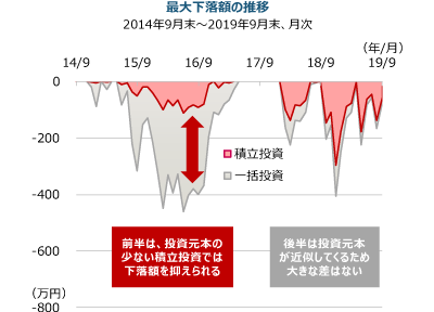 (注2)一括投資における最大下落額は評価額の高値からの下落額。積立投資における最大下落額は、各積立投資における評価額の高値からの下落額を合算した額。