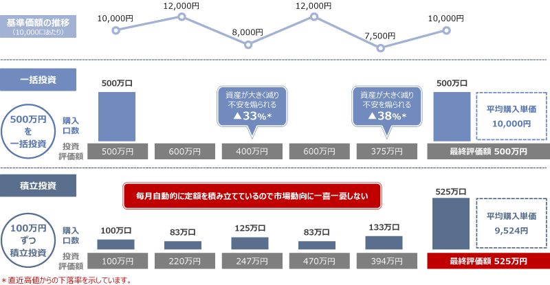 上記は、ドル・コスト平均法の概念を説明するためのイメージです。手数料・税金など諸費用は考慮していません。ドル・コスト平均法は将来の収益を約束したり、相場下落時における損失を防止するものではありません。相場環境によって積立投資よりも一括投資のほうが有利になる場合があります。