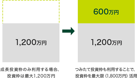 2024年以降のNISAでは、成長投資枠のみ利用する場合、非課税保有限度額は最大1,200万円ですが、つみたて投資枠も利用することで、非課税保有限度額を最大限(1,800万円)活用できます。