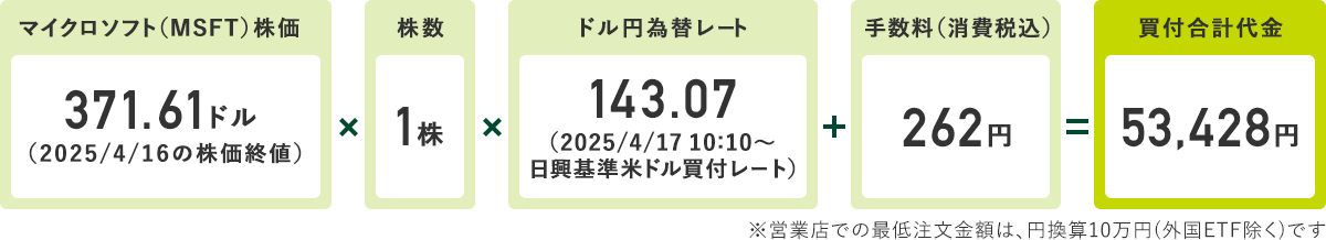 仮にダイレクトコースの方が日興イージートレードを利用して、マイクロソフト(MSFT)1株を円貨決済で購入した場合、