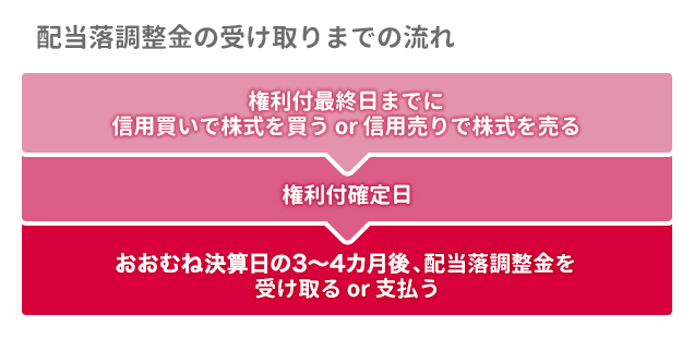 買い方は証券会社から、配当金に相当する金額を配当落調整金として受け取ることができます。