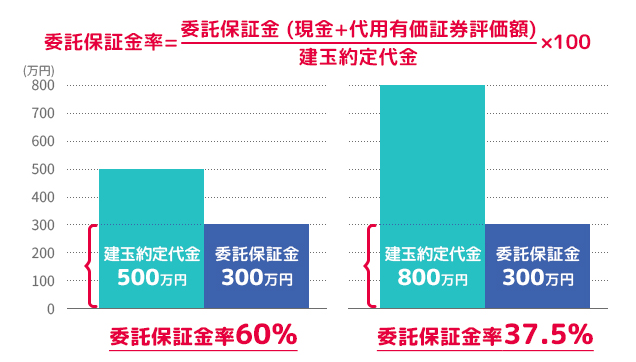 例えば、委託保証金が300万円、建玉約定代金が500万円なら委託保証金率は60%、建玉約定代金が800万円なら委託保証金率は37.5%となります。