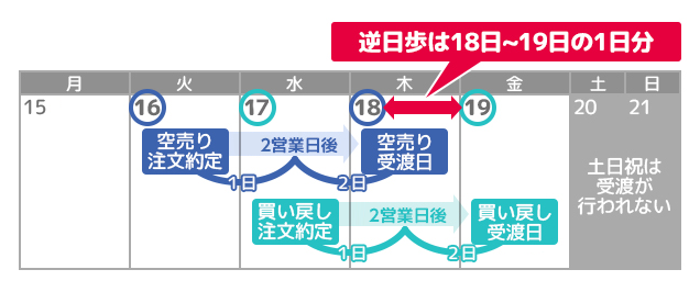 解説図のように、空売り注文が16日(火曜日)に約定し、買い戻し注文が翌17日(水曜日)に約定したとします。受渡日は2営業日後なので18日(木曜日)が空売りの受渡日、19日(金曜日)が買い戻しの受渡日になります。