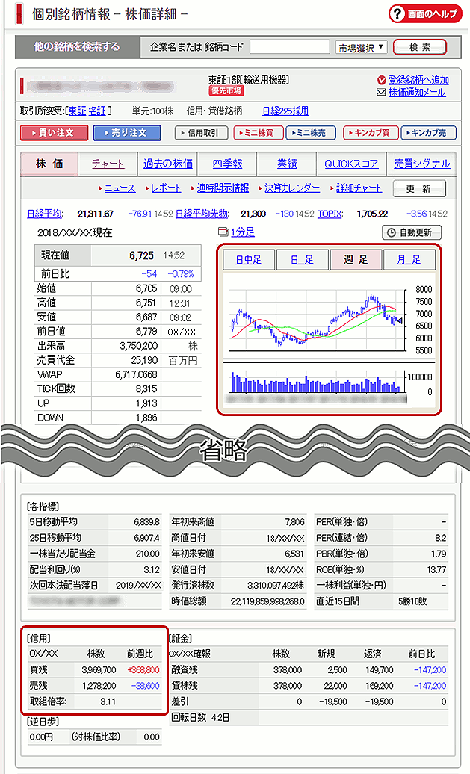次に株価について見てみます。上の画面の右上のチャートを見ると、7,000円台後半の高値を付けた後、6,500円水準まで値下がりしています(日興イージートレードでは、「個別銘柄」画面の右上にある「週足チャート」を確認します)。上向きだった移動平均線は横ばいとなり、現在値6,725円は、2つの移動平均線を下回る水準です。