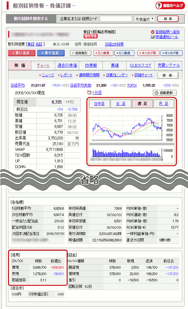 まずは、オンライントレード(日興イージートレード)の個別銘柄情報画面を使って、信用残高の見方を説明していきます(日興イージートレードでは、画面左下の[信用]の項目「買残」「売残」で確認できます)。