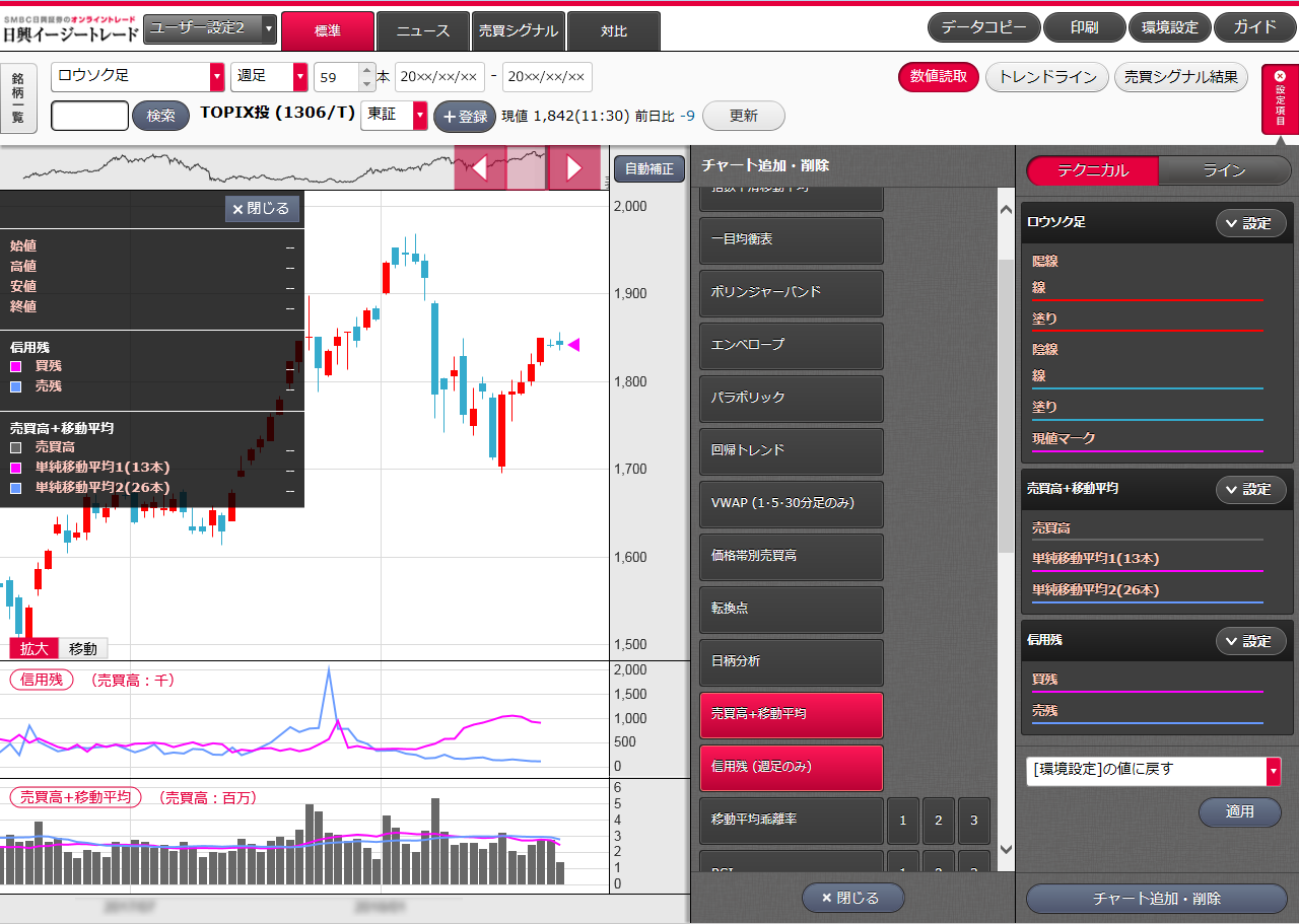 日興イージートレードの場合、「詳細チャート」でチャート部分にカーソルを合わせると、信用残高を確認することも可能です。株価の動きを全て予測することはできませんが、株価が下落・信用買い残高が増加という情報から判断すると、損失を抱えた信用買い残高の将来的な売り需要が高まっている状況にあるといえます。