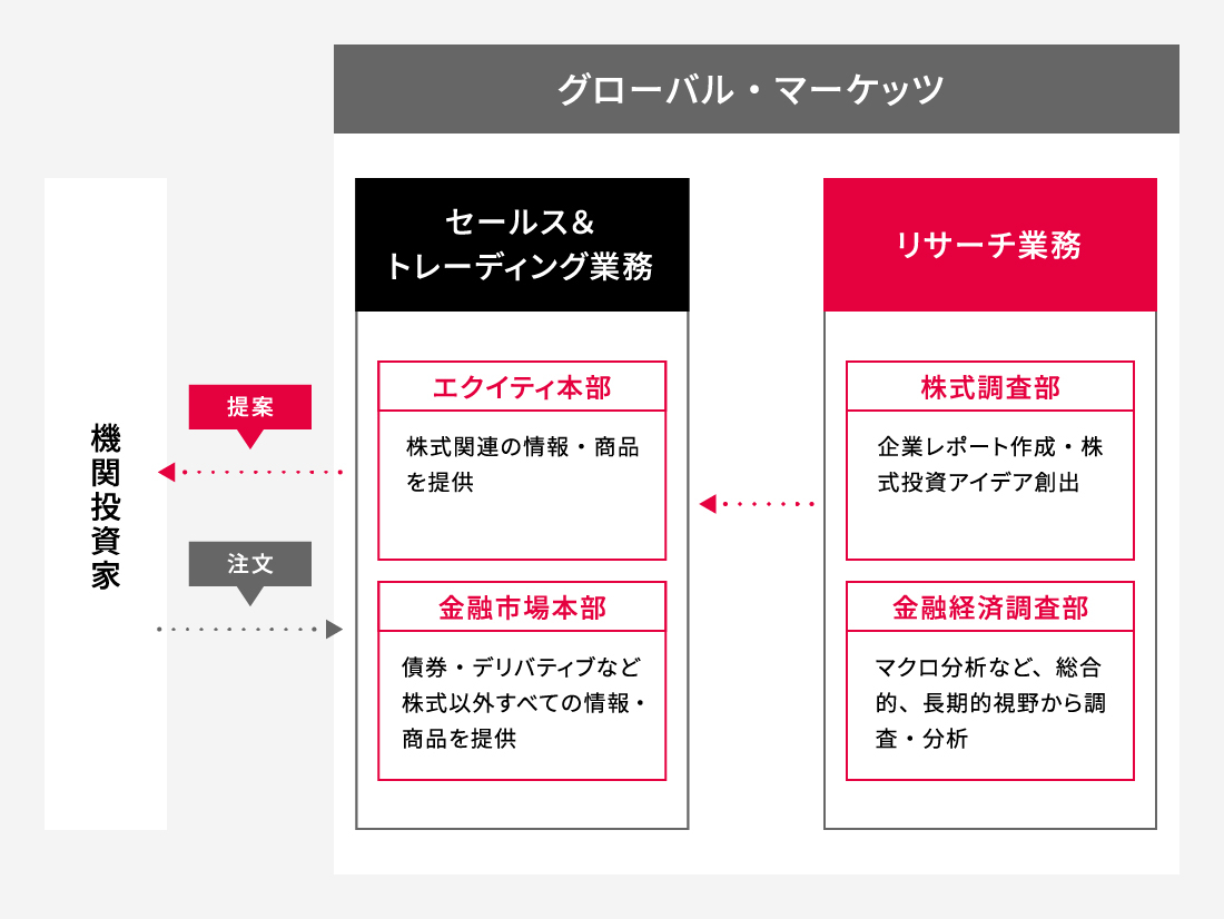 銀行や保険会社、運用会社、ヘッジファンドなど、国内外の機関投資家に対して、商品情報やマーケット情報を提供することで、お客さまの投資活動を支えます。業務内容は、商品の開発・提供を行うセールス&トレーディング業務と、市場調査を通じた情報発信を行うリサーチ業務に大きく分けられます。