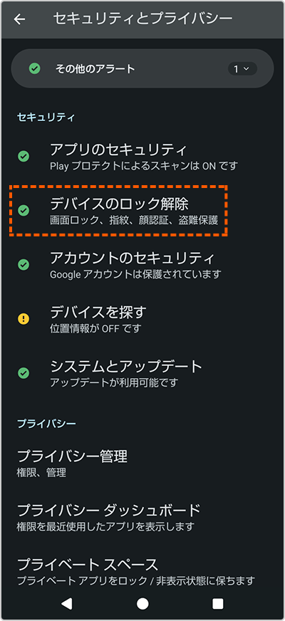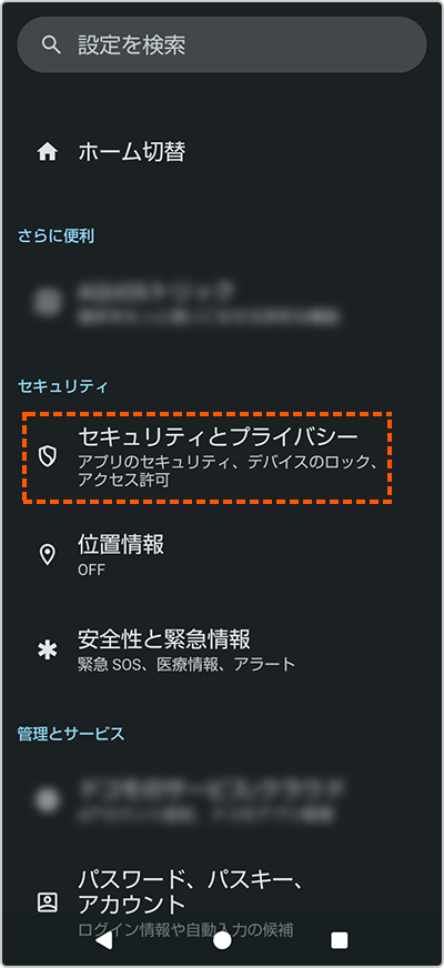 - ※「セキュリティ」や「セキュリティ設定」と表示される機種もあります。