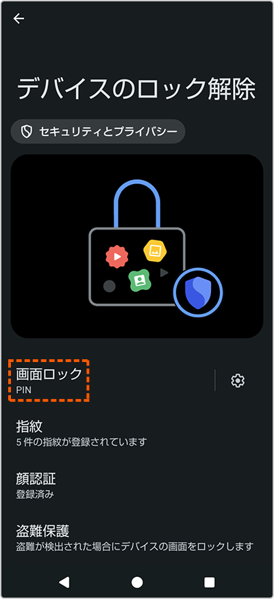 - ※「画面ロック」「ロック解除方法の設定」等と表示される機種もあります。