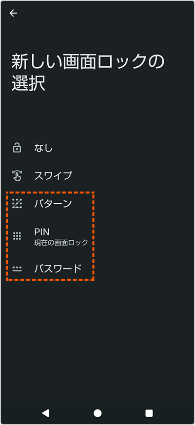 「なし」や「スワイプまたはタッチ」となっている場合は、「パターン、PIN、パスワード」のいずれかを選択します。
