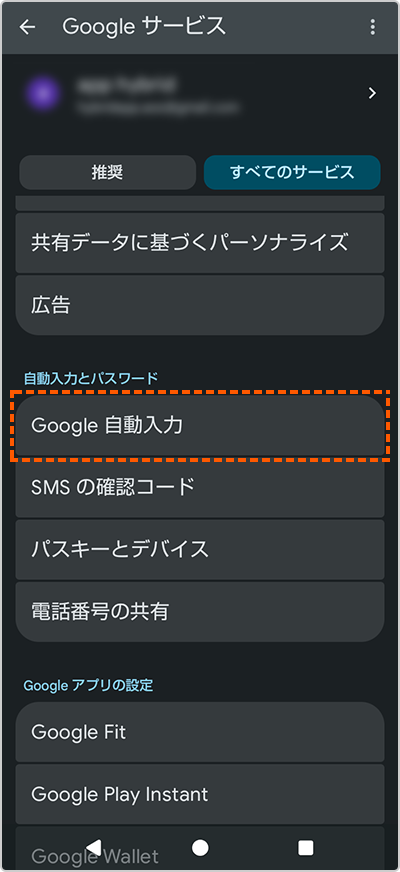 3.「すべてのサービス」>自動入力とパスワード「Google自動入力」をタップします。