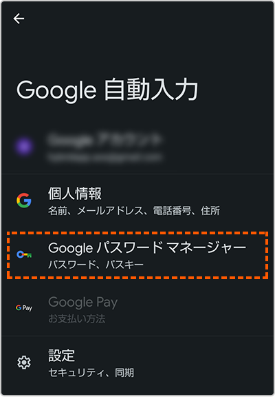 - ※「Google パスワードマネージャー」がない場合は Google Play(アプリストア)から「Google パスワードマネージャー」をインストール後、改めて設定をご確認ください。