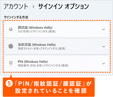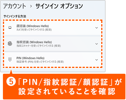 設定2:Windows Hello(PINや指紋認証、顔認証など)の設定方法