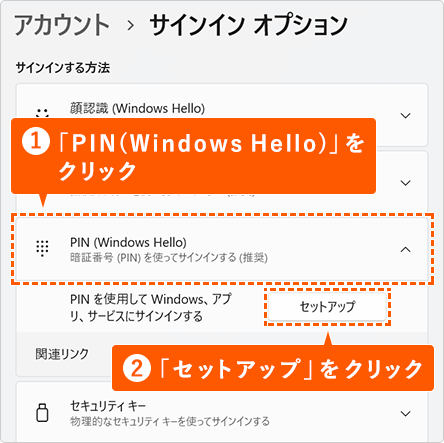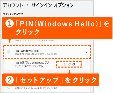 6-1.「PIN(Windows Hello)」の「セットアップ」をクリックします。