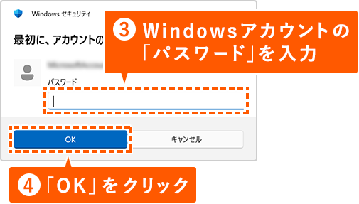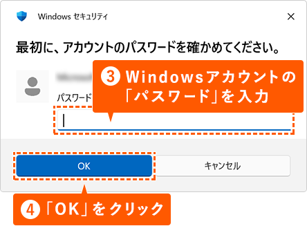 6-2. パスワード入力画面が表示されるので、Windowsアカウントの[パスワード]を入力します
