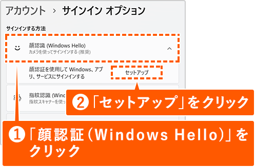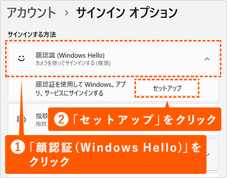 8-1. 「顔認証(Windows Hello)」の「セットアップ」をクリックします。顔認証(Windows Hello)の表示がない、またはセットアップがクリック出来ない場合は、顔認証を利用できません。