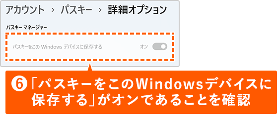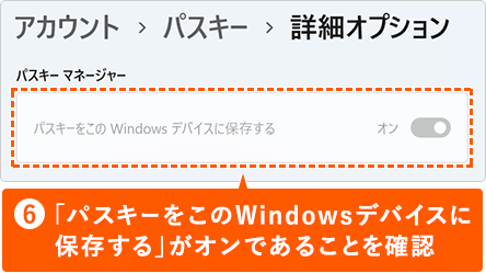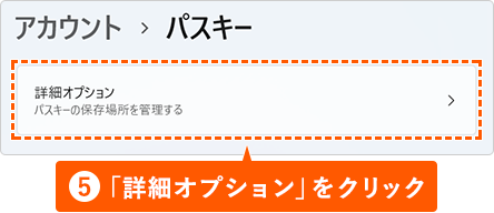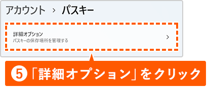 5.「詳細オプション」をクリックします。パスキーの保存先が「このWindowsデバイスに保存する」(既定のもの)となっていることを確認します。なっていない場合は、「Windows既定」 を選択します。