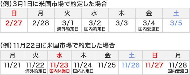 また、日興イージートレード米国株式取引の国内約定日は、ご注文が約定した米国市場の営業日(海外約定日)の翌国内営業日となります。国内受渡日は、国内約定日から起算して3営業日目となります。