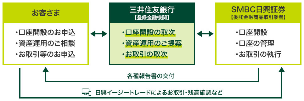 SMBC日興証券の日興イージートレード(オンライントレード)、SMBCサポートデスクでのお取引は、SMBC日興証券との直接取引となります。