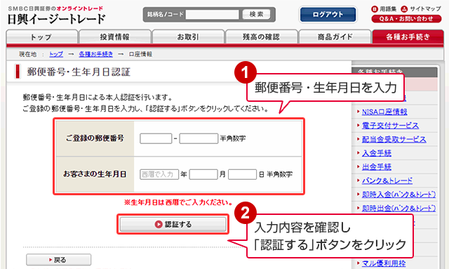 日興イージートレードへログイン後、ご本人認証のため、ご登録の郵便番号・生年月日を入力し、「認証する」ボタンをクリックします。