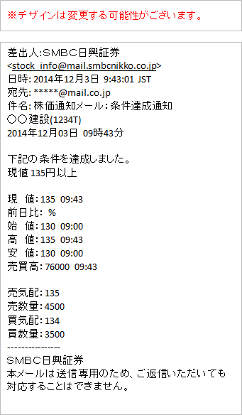 | 株価があらかじめ設定した条件にヒットしたときにEメールでお知らせするサービスです。 【配信頻度】不定期(株価が設定条件に合致したとき) |