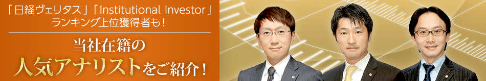 | 企業レポート | 随時 | 主要企業(カバレッジ銘柄)の株価、業績などを調査・分析し、目標株価や投資評価(レーティング)などを提供。また、カバレッジ企業のニュースおよびそれに対するアナリストのコメントもタイムリーに提供いたします。 ※レポート発行日の翌営業日に掲載されます。 |