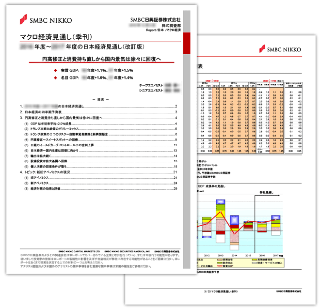 | 日本経済予測(季刊) | 季刊 | SMBC日興証券のマクロ見通しのハウスビュー。日本・世界経済、金融市場、経済政策を分析し、今後の日本経済の方向性を示します。 |