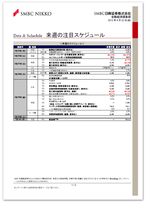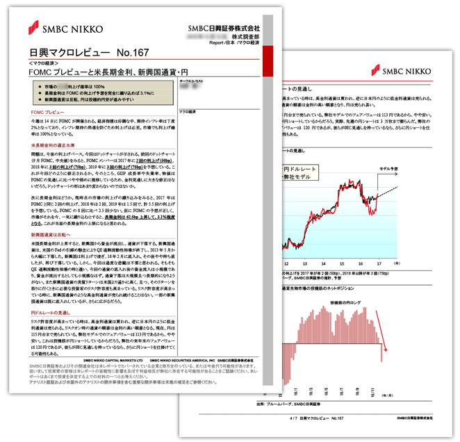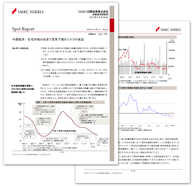 | Spot Report(マクロ) | 随時 | Spot Report(マクロ)は、マクロ経済環境に関する注目すべきトピックをいち早く提供する、機動性を重視したレポートです。投資環境の変化が激しい現在、旬の情報を提供いたします。 |