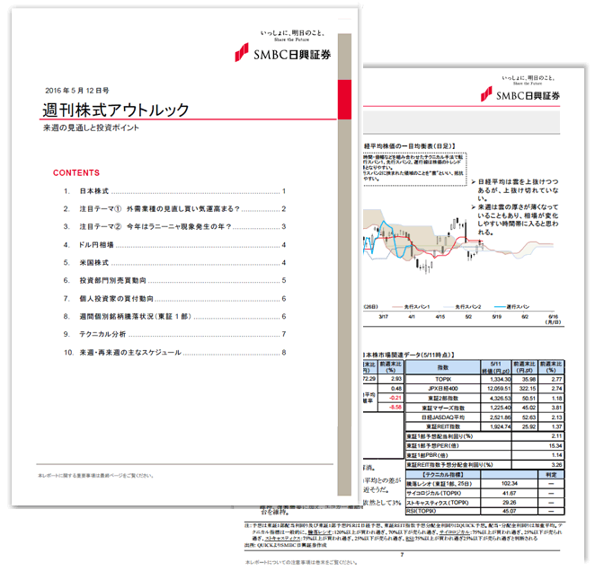 週刊株式アウトルックは日経平均の短期的な見通しや個別銘柄アイデア、投資家別売買動向などをまとめた日本株総合情報資料です。 |